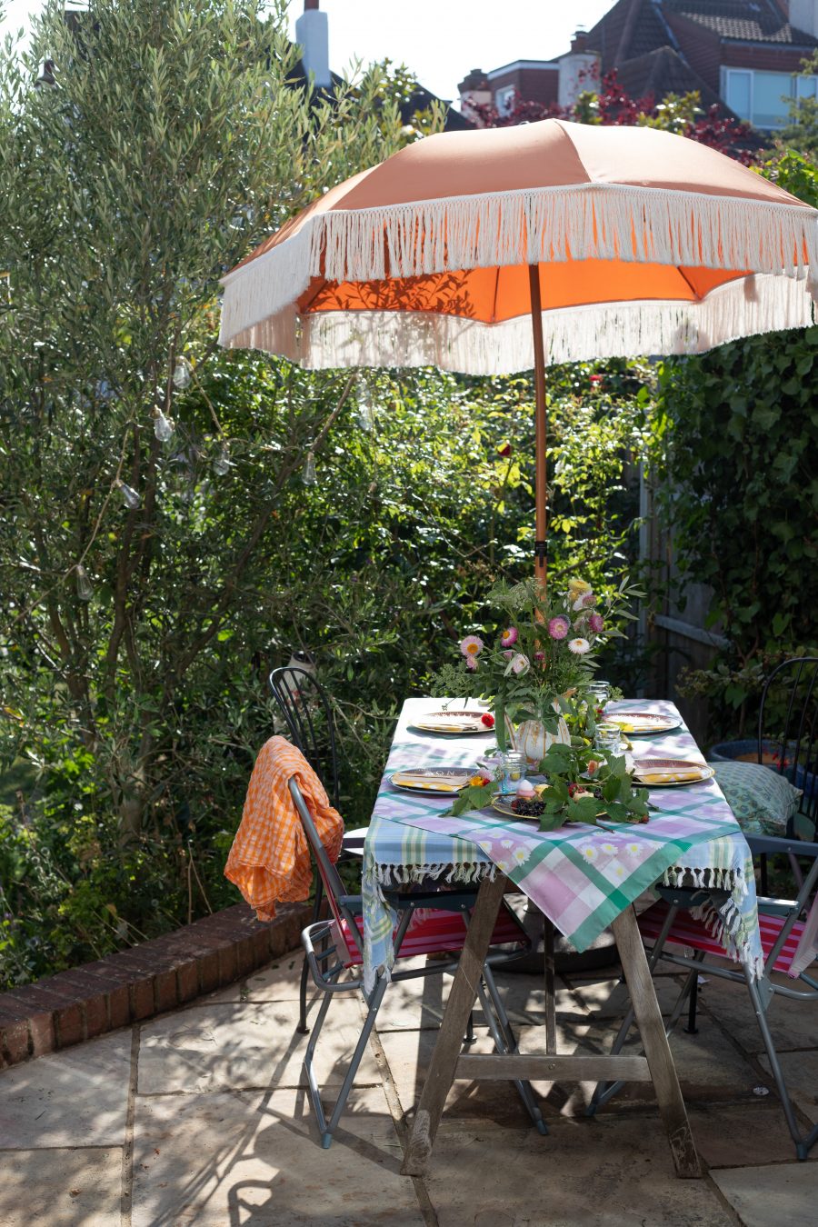For this table I lent into a mix of playful checks. First layering our garden table with a vintage tablecloth and then adding the picnic blanket (at an angle) on top. From there I grabbed a jug of table flowers. These are the flowers I have in my home when I’m not working. They are a simple mix of blooms gathered from the garden and allotment. As I’m in wedding season creating precise arrangements. I want my personal flowers to feel loose and pretty. This arrangement includes; Olive, Sedum, Strawflowers, Ammi and Echinops.