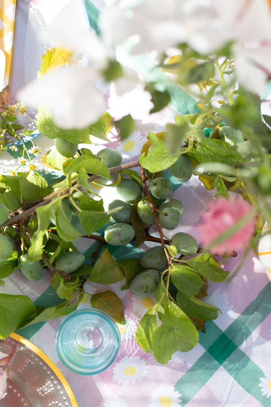 To go a little extra and bring the allotment to the table. Branches of plums were snipped (don’t tell my Dad, guardian of the plum tree) and laid along the centre of the table. It was hot at the allotment last week, the plum tree gave much needed shade and cast everything in such a pretty dappled light, I couldn’t resist. Even unripe they smelt so sweet, it kept wafting over the table as I was setting it. Gorgeous!