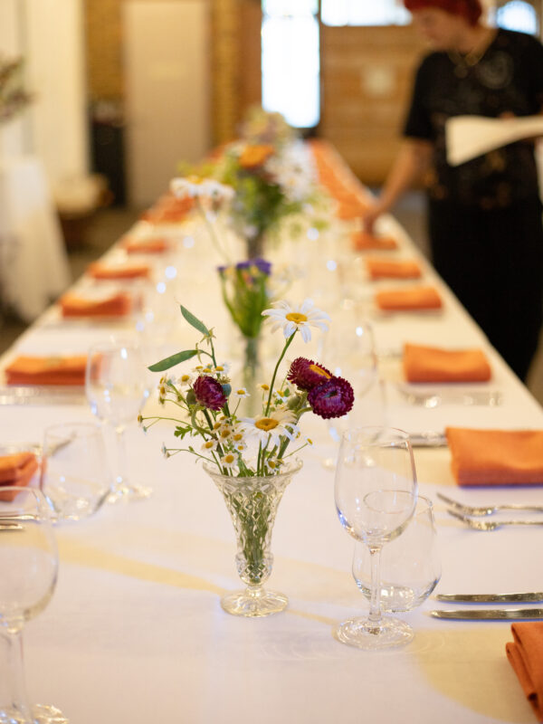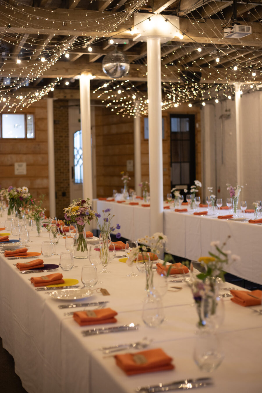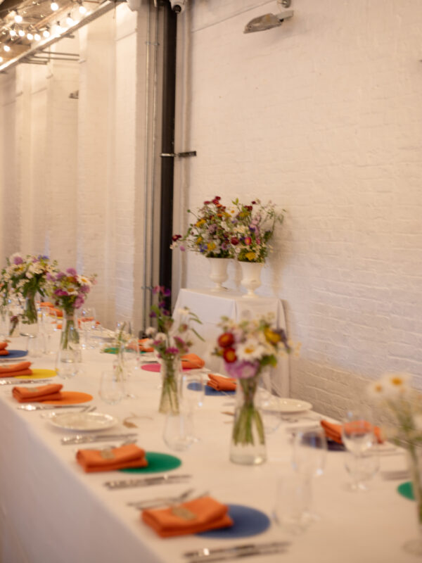 The couple opted for long bench style seating for the wedding breakfast. I encouraged them to used the bouquets as part of the table set up. Using smaller posy style bouquet on tables is a great way to maximise a floral budget. All my bouquets are delivered in vases so it made sense to use them.