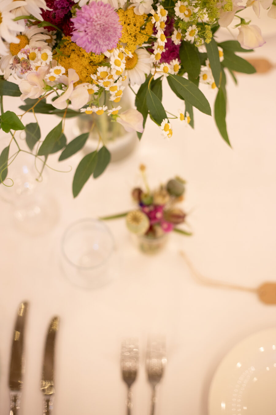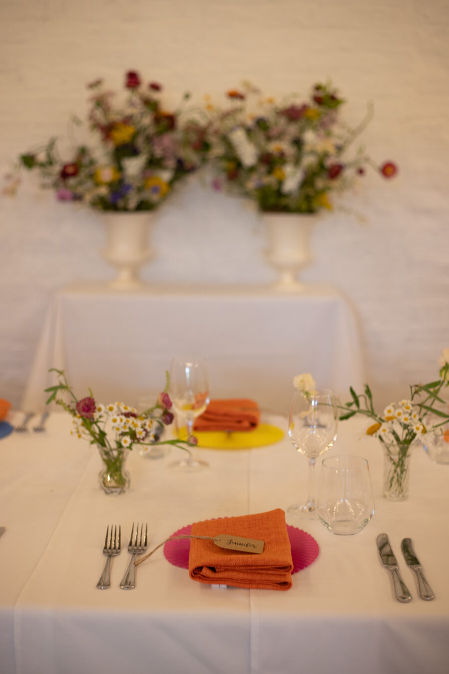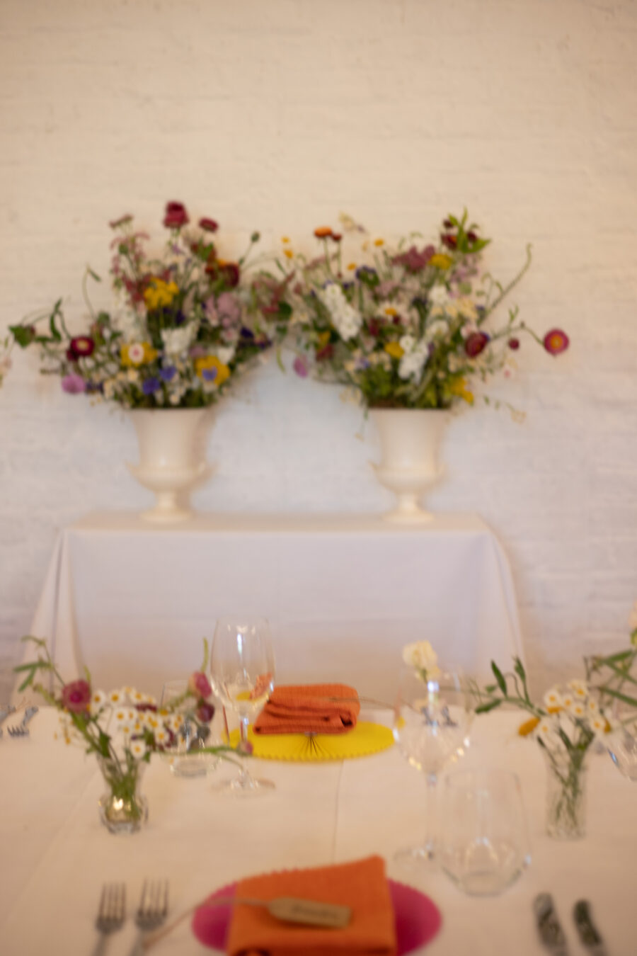 The urns were filled with a mix of colourful and wild looking flowers. Just to reiterate, nothing I grow is wild. Everything is planned and grown to last and withstand events like weddings. When I arrange everything, I choose different styles. For this I let things look liked they had naturally tangled, which was harder to achieve than you might think. Initially, I added eycalyptus leaves but found them too dominant and light sucking. Half way through I restarted to keep them feeling light.