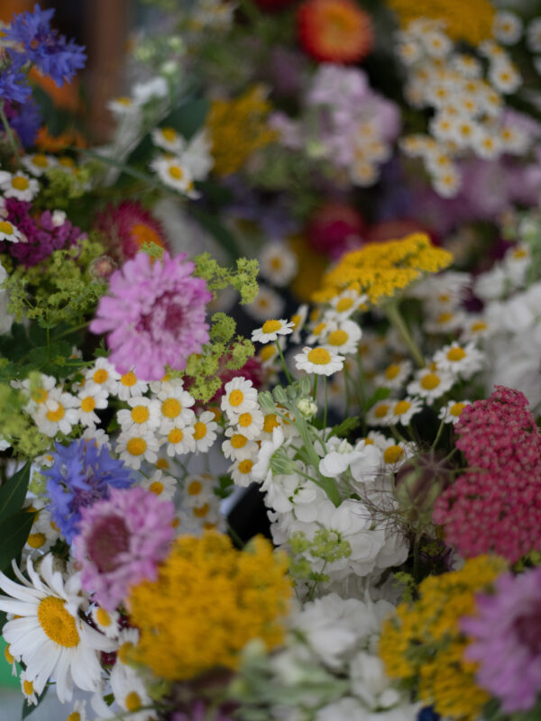 Flower wise, I used stocks as the anchor flowers. Stocks are such a great support flower, super pretty but not showy. Their spicy clove scent adds so much to any arrangement. Also included; sweet pea pods, strawflowers, achillea (I’ve planted loads this summer as a result of this wedding), marguerite and feverfew daisies , cornflowers and poppy seed heads. It was a great mix of textures and tones, a detail I picked up when the bride came to visit the garden.