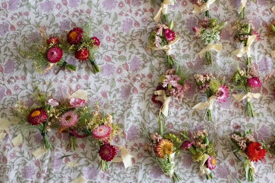 For a personal touch the bride wanted everyone to have a corsage. Such a great idea, the guests loved it. Being September it was prime season for an abundance of dried flowers. Each buttonhole was made using a mix of strawflowers (helichrysum), statice, fennel, hydrangea and much, much more.