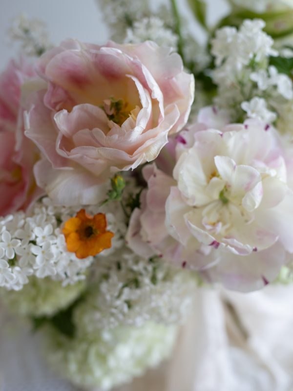Alongside the tulips are handfuls of white lilac. This white variety is a lovely self seeder and came into full bloom the day it was picked. Although fleeting, it smells delicious. If you got the right week, it’d be amazing in a wedding bouquet. I always sear the ends of my stems to keep them looking as fresh as possible.
