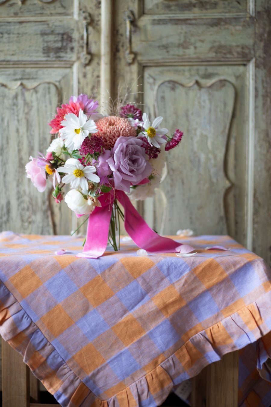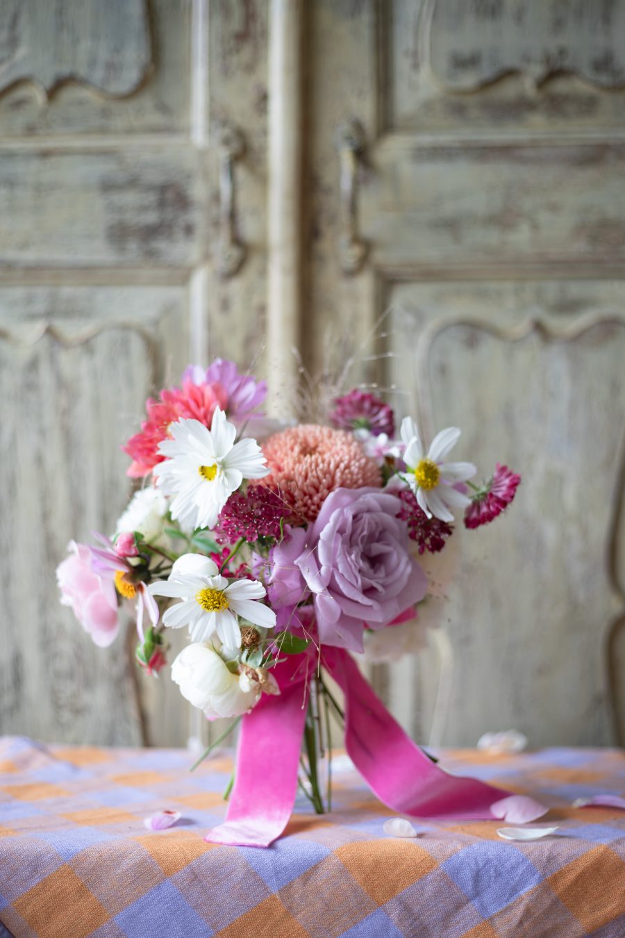 I always tie the original bouquet really gently placing in water to ‘chill out’ for a while. When I return the flowers have found their place. Only then do I make any last minute amends and always finishing with a big bow. If I can!