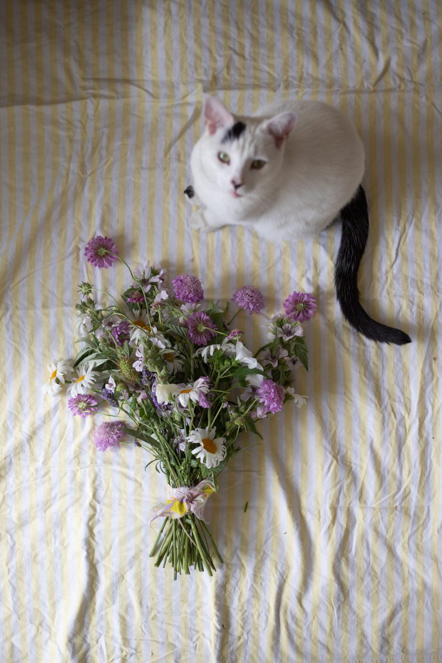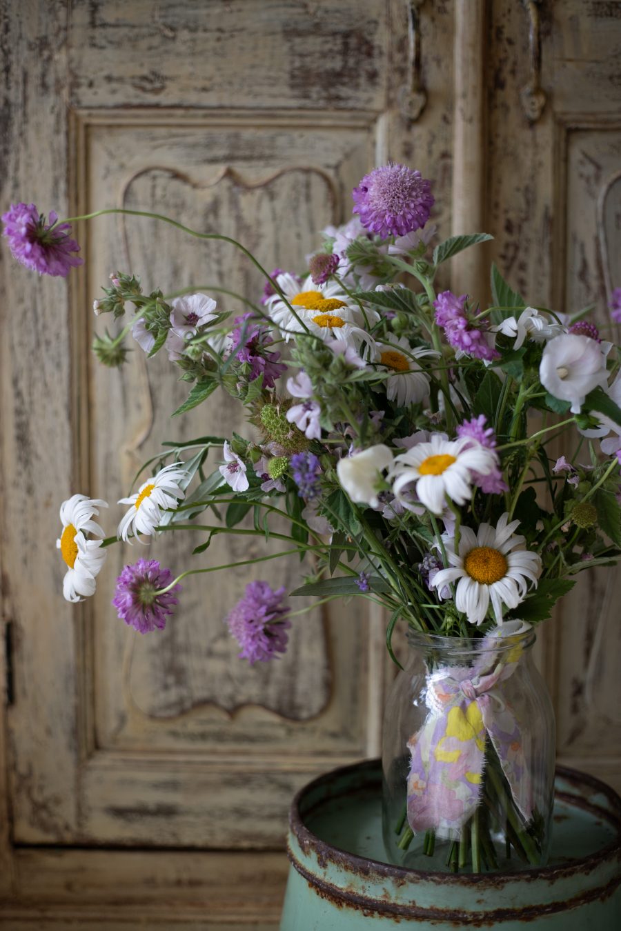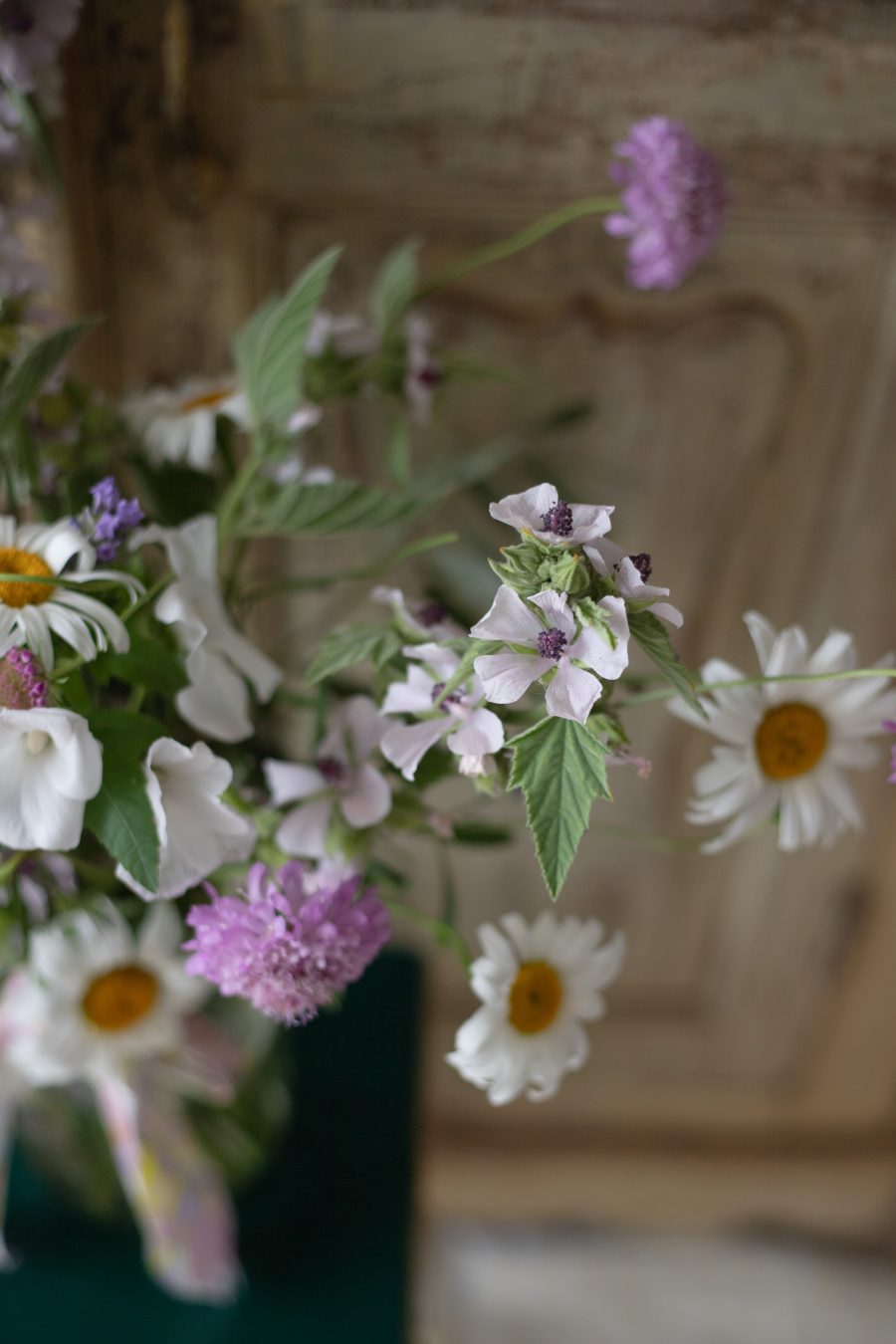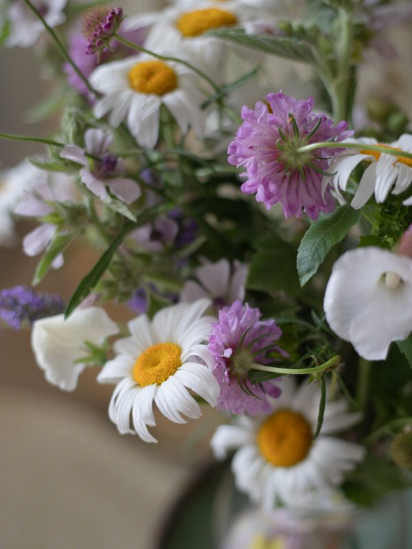 This bouquet is a wild tangle of late June flowers. Marguerite daisies leftover in a bucket (they don’t smell great), scabiosca and mallow and marshmallow hung out together to create this quick display. I went for a simple hand-tie style. As the weather gets hotter, I’m leaning to a more ‘undone’ style of bouquet. A gathering of free-flowing stems.