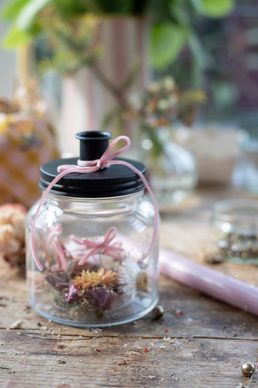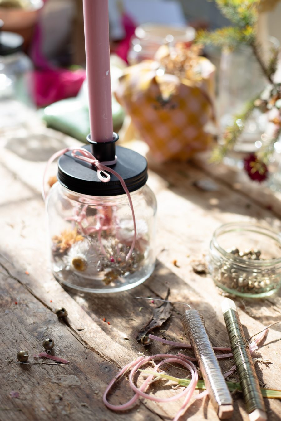 To finish make tiny bows from thin ribbon, I’m on a velvet kick, but see what you have an use that. I made tiny loops of wire and stuck the bows onto the ‘wire sticks’ and then added into the wreath. To finish I carefully placed into my jar and added another velvet bow and candle.