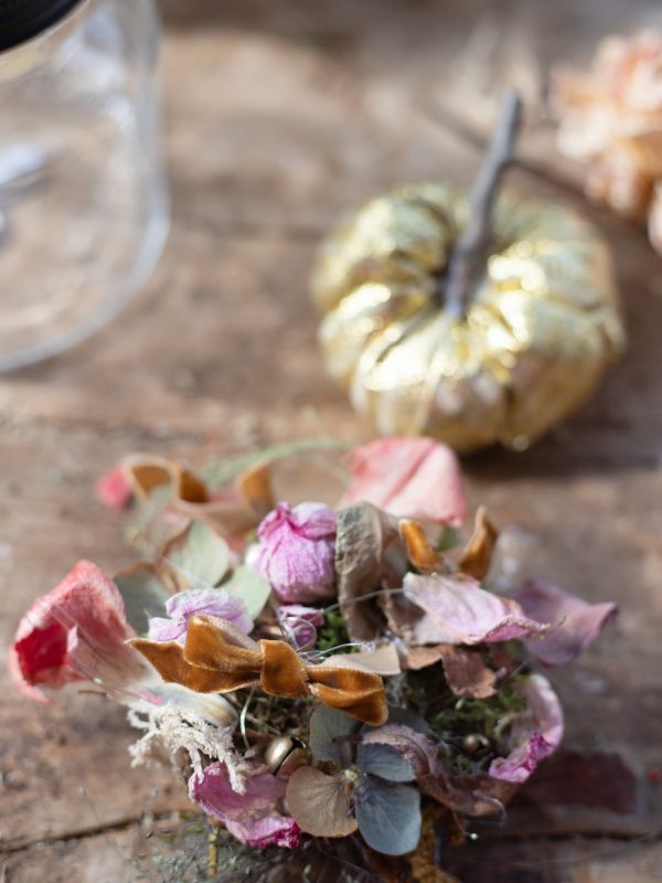 There is a secret wreath making guide here which should help you. Taking some craft wire, for this gold or silver look more intentional, take a length of wire and start to wrap moss, leaves, flowers, etc onto your wreath base. If you want to add more, you can include beads, bells or fabric scraps into the wreath. Aim to have bits moving and off the wreath base so it feels alive with texture.