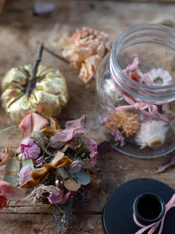 If there are any flower heads or seeds pods that won’t stay put, get a glue gun out an glue into place.